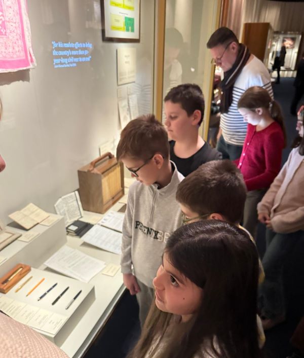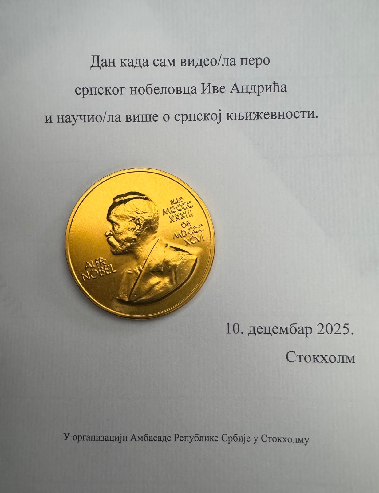 U pratnji ambasadora Republike Srbije u Kraljevini Švedskoj Jelene Čukić-Matić i svoje profesorke srpskog jezika Dragane Mišković-Daberer, učenici su se upoznali sa bogatim sadržajima muzeja, uključujući i naliv-pero našeg nobelovca Ive Andrića i detaljnije upoznati sa Andrićevim životom i delom.