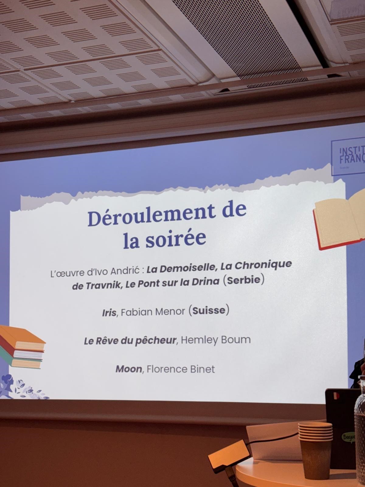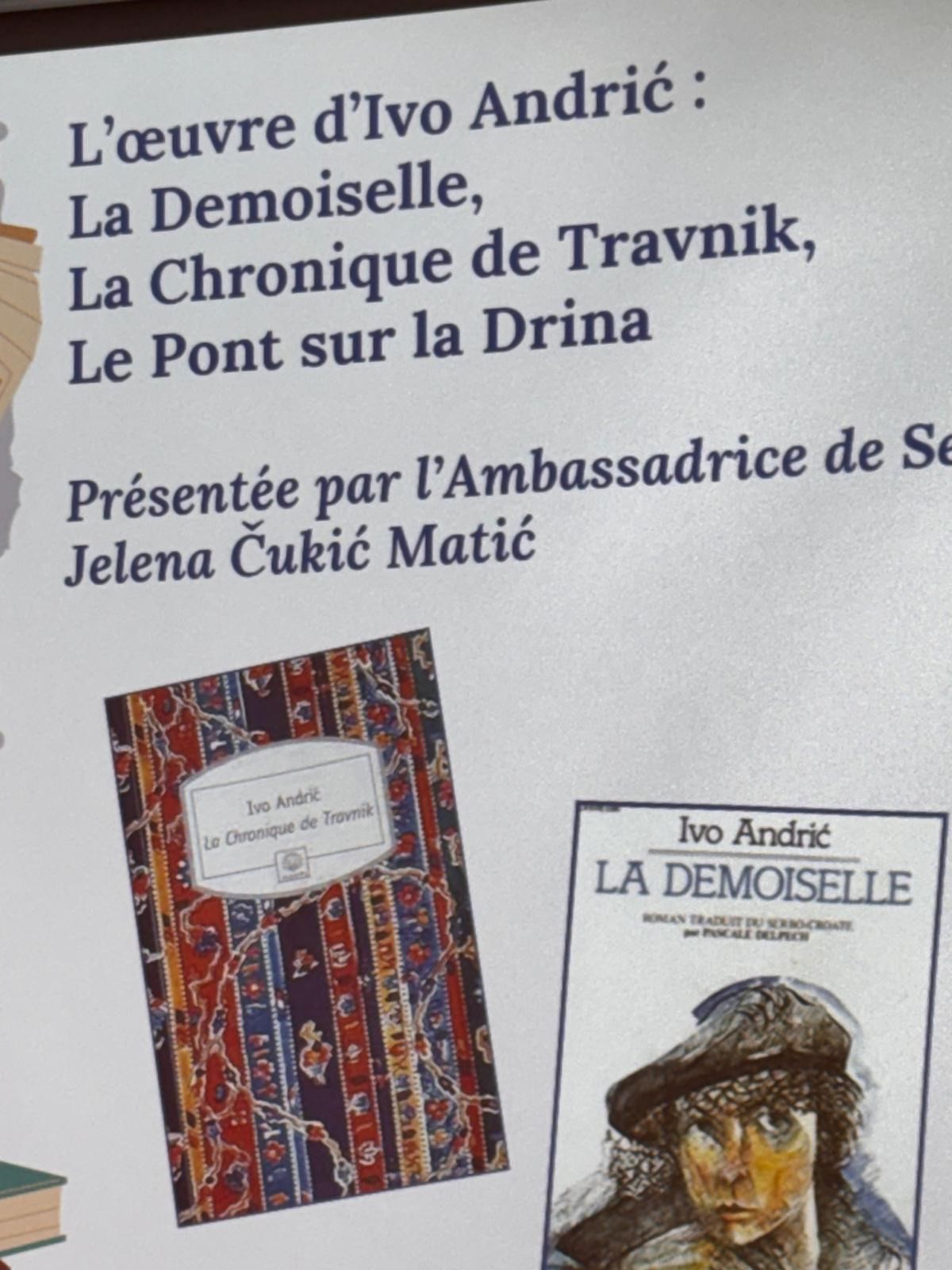 Том приликом, амбасадорка Републике Србије Јелена Чукић-Матић обратила се присутнима на француском језику и представила књижевно стваралаштво Иве Андрића, са посебним освртом на комплексне и упечатљиве женске ликове у његовим делима. Излагање је било у складу са овогодишњом темом „La Francophonie avec elles“ („Франкофонија са њима“), посвећеном афирмацији жена и темама феминизма.