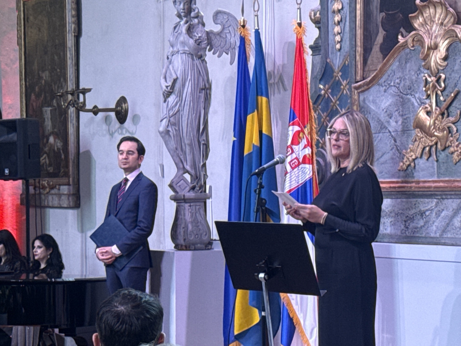 Свечаност је улепшана концертним наступом два реномирана српска сопрана Биљаном Стафансон и Љиљаном Миловановић Јовановић уз пратњу еминентне пијанисткиње Милице Лундин. Поред класичних дела опере и интернационалног вокалног репертоара, традиционална и класична дела шведских композитора су такође представљена публици. Свечаност су украсила дела О девојко рођена, бела лица румена из колекције Српских напева Алојза Калауза, затим арија Тамо за том гором из прве српске опере На уранку композитора Станислава Биничког, да би наступ био заокружен композицијом Што се боре мисли моје Алојза Калауза и Корнелија Станковића уз стихове принца Михаила Обреновића.